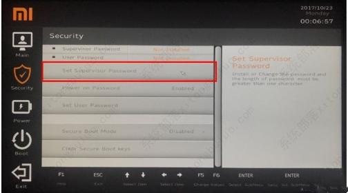 1、开机过程中不停按F2进入BIOS设置,光标移动到Security,点击Set Supervisor Password设置一个BIOS密码,输入两次相同的密码,点击YES保存;