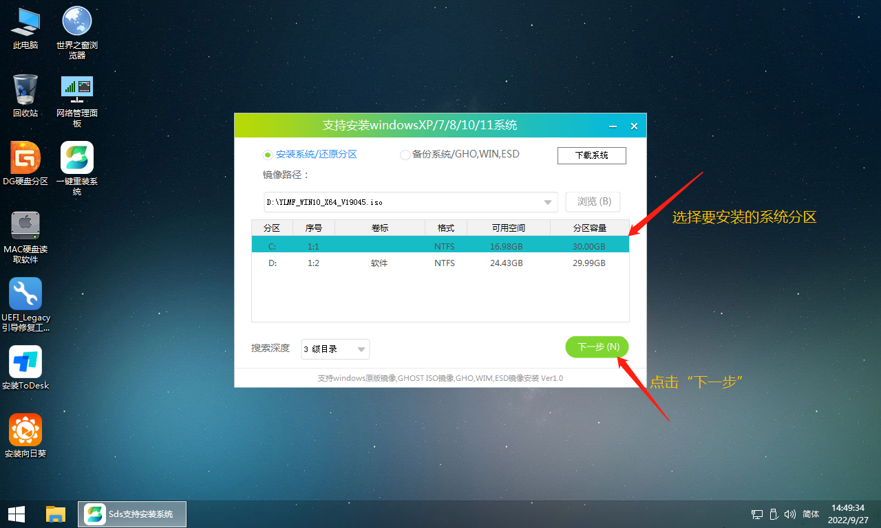 第三步:选择系统分区(一般会默认为C盘,选择用来安装系统的分区)点击“下一步”。