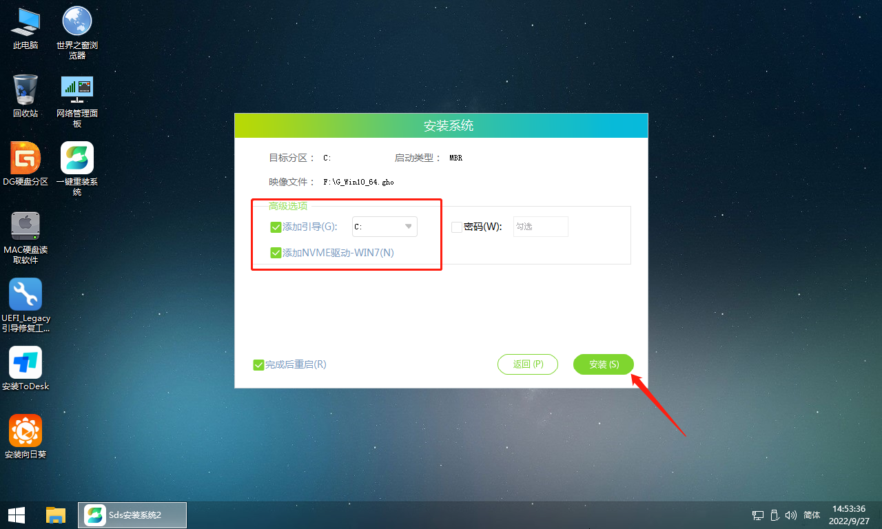 第四步:默认添加引导及NVME驱动-WIN7,点击“安装”。