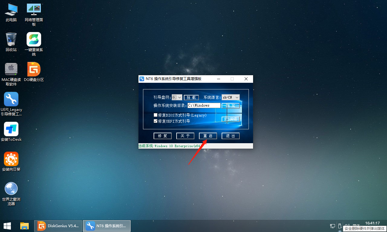 第八步:点击“重启”查看是否可正常进入系统桌面,如果不行可选择再次进入PE重装系统。