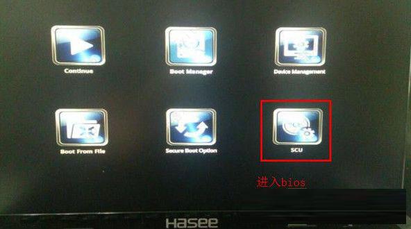1、首先开机按ESC键,出现下图所示界面后选择右下角的“SCU”进入bios设置界面。