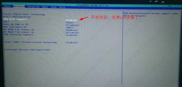 2、接着通过键盘上的左右方向键切换到“Advanced”界面,可以看到USB BIOS Support当前处于“Disabled”状态,这代表不支持usb设备,如下图所示。