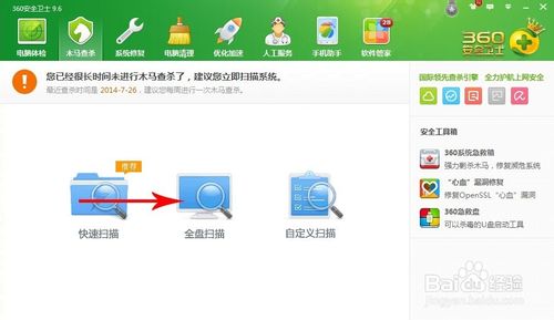 首先我们使用安全卫士来对电脑进行全盘扫描,查看是不是因为中毒引起的故障。