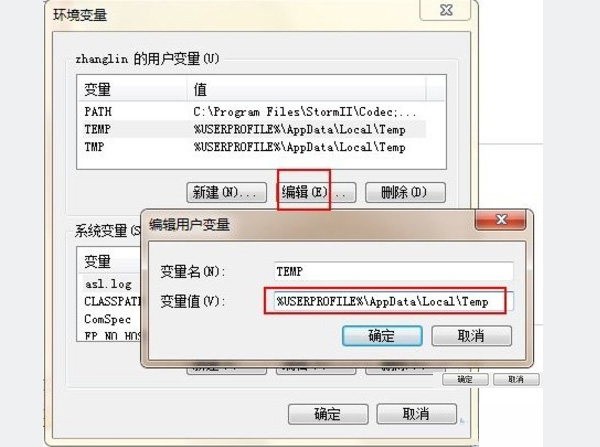 三、在环境变量对话框中分别选中“TEMP”和“TMP”,点击“编辑”按钮。