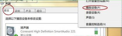 首先我们右键点击任务栏中的小喇叭图标,选择播放设备打开声音窗口。