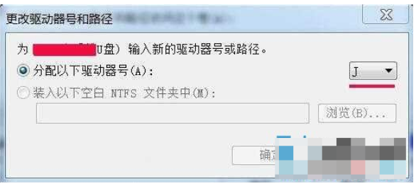 4、然后点分配以下驱动号后面的框,选择一个电脑其他硬盘或者磁盘没有被使用过的盘符,比如J盘,然后点确定。