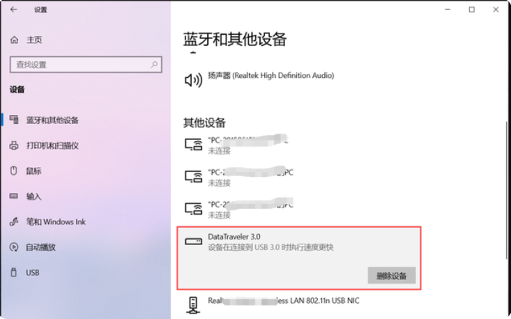 3、我们在左侧栏目中选择蓝牙和其他设备,然后在右侧的列表中我们可以看到U盘,点击删除设备。