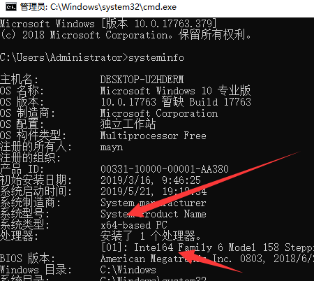 2、打开管理员窗口中输入命令:systeminfo,点击回车,这时候我们就可以看到系统和处理器的位数