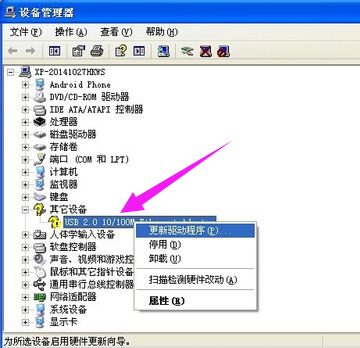 在”USB以太网控制器“上右键选择“更新驱动程序”