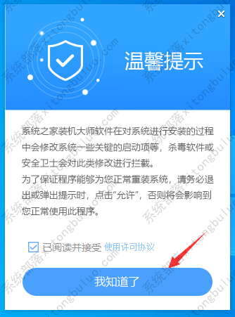 1、下载安装系统之家一键工具,首先关闭所有的杀毒软件,然后打开软件进行提示,仔细阅读后,点击我知道了进入工具。