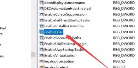 3、在右侧找到“EnableLUA”注册表键值。