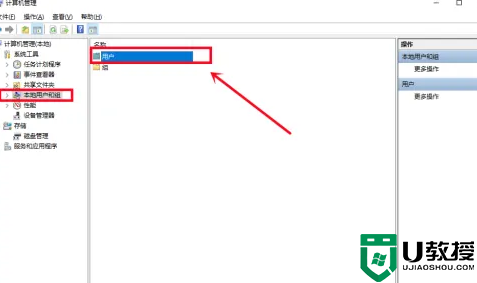 2、弹出窗口,点击左侧的本地用户和组,再双击右侧的用户。