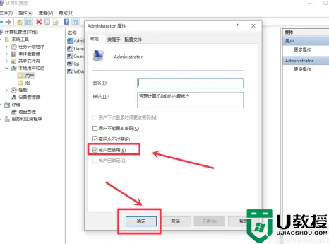 4、弹出的窗口中,将“帐户已禁用”取消勾选,点击确定。