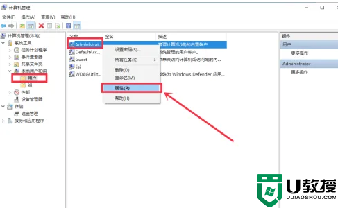 3、然后在页面中,鼠标右键点击Administrator,再点击属性。
