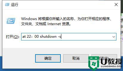 4、如果我们想在固定的某个时间点关机,那么命令为“at 时间 shutdown -s”,比如说想要在晚上十点整关机,运行窗口输讨耕入“at 22:00 shutdown -s”即可;