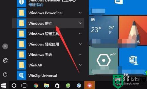 1、在Windows10桌面点击开始按钮,在弹出菜单中找到Windows附件菜单项。