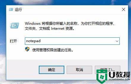 2、在打开的Windows10运行窗口中,输入命令notepad,然后点击确定按钮,这样也可以打开记事本。