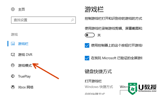 3、进入到游戏设置界面之后,在弹出的页面的左侧栏中,点击“游戏模式”。