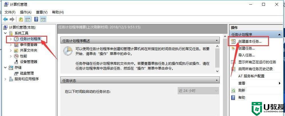 2、然后单击“系统工具”栏下的“任务计划程序”,最后在最右侧的“操作”栏中,点击“创建基本任务”,开始一个新的任务。