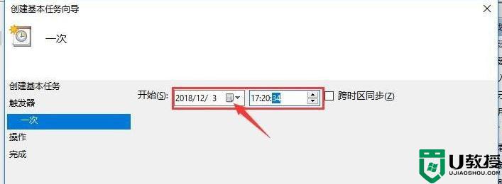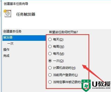 4、希望任务何时开始:及关机设置的频率。只是使用一次,点选“一次”,然后点击“下一步”即可。这里我们选择“一次”。