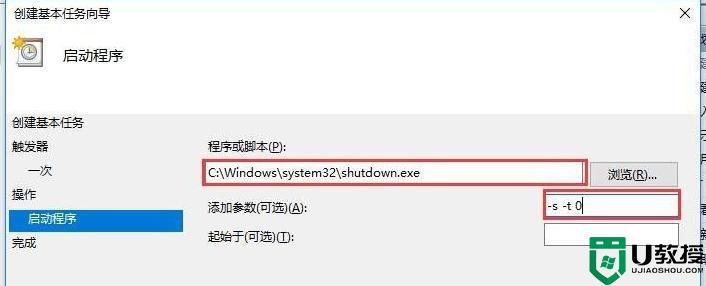7、进入“启动程序”项,如果系统在C盘,那么在“程序或脚本”框内输入“C:Windowssystem32shutdown.exe”,如何系统安装在别的盘,修改下盘符即可,然后在“参数”处填入“-s -t 0”(即立即关机),然后点击“下一步”。
