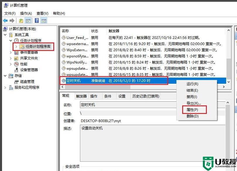 9、最后我们可以在“任务计划程序库”中找到我们的计划任务,单击右键点击“属性”,可以对其进行详细的修改,来完成我们的关机需求。