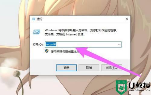 1、按下win键和R键,输入命令【regedit】,点击确定。