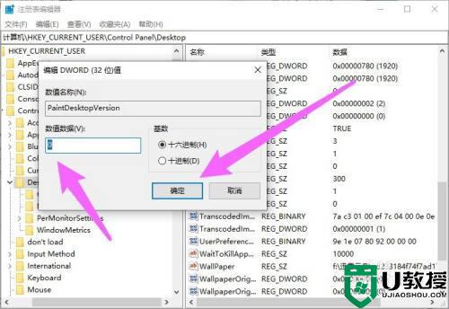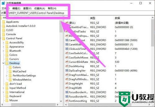 2、依次打开路径为【HKEY_CURRENT_USERControl PanelDesktop】的文件夹。