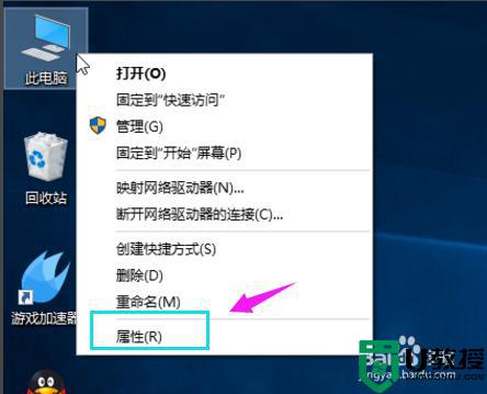 1、鼠标右键点击“此电脑”图标,选择“属性”。