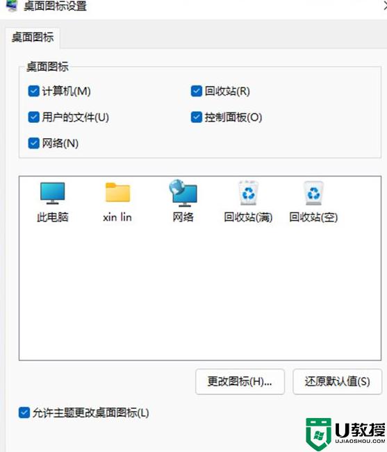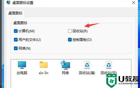4、进去桌面图标设置界面之后,可以看到回收站图标已经勾选上了。