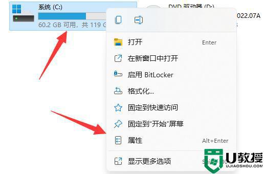 2、接着右键系统盘,打开“属性”。