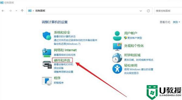 2、在控制面板里点击硬件和声音(注意右上角查看模式为类别,才可以看到硬件和声音选项)。