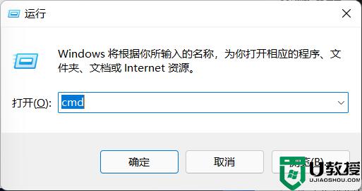 3、在“打开”输入框内输入“cmd”(可勾选“以系统管理权限创建此任务”),回车;