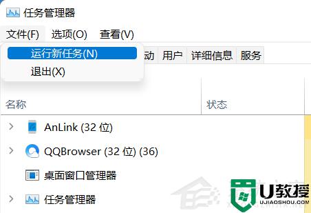 2、打开“任务管理器”后点击“文件”--》“运行新任务”;