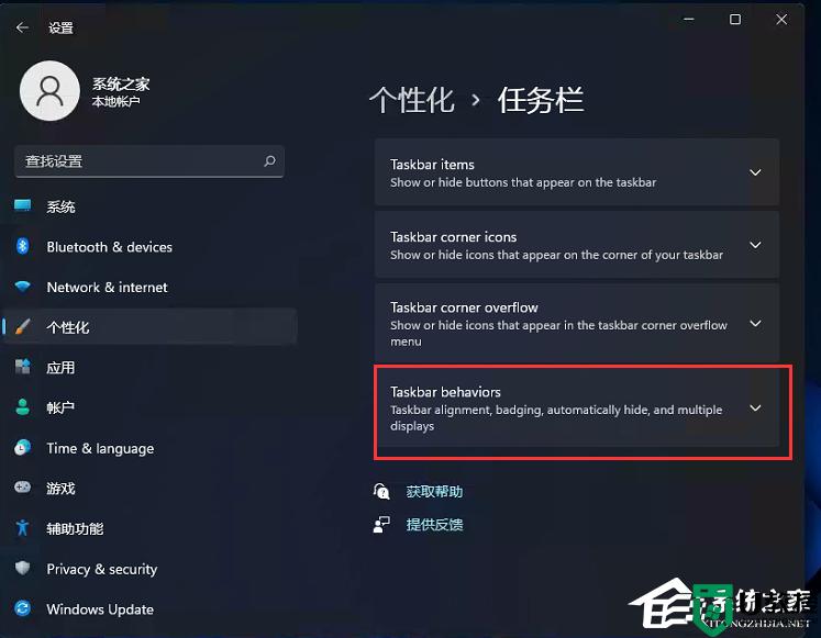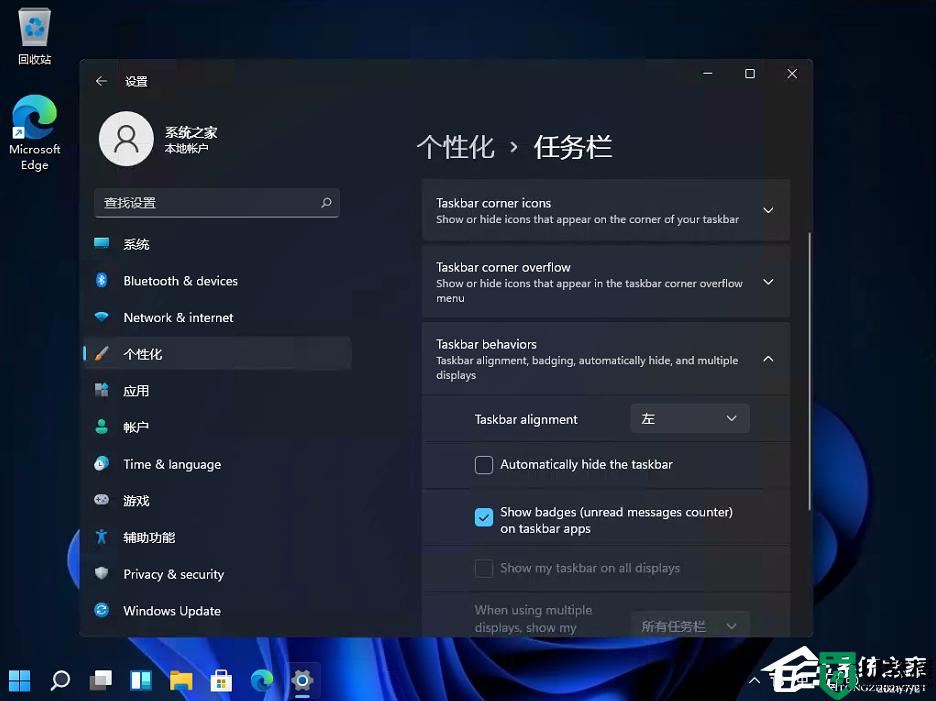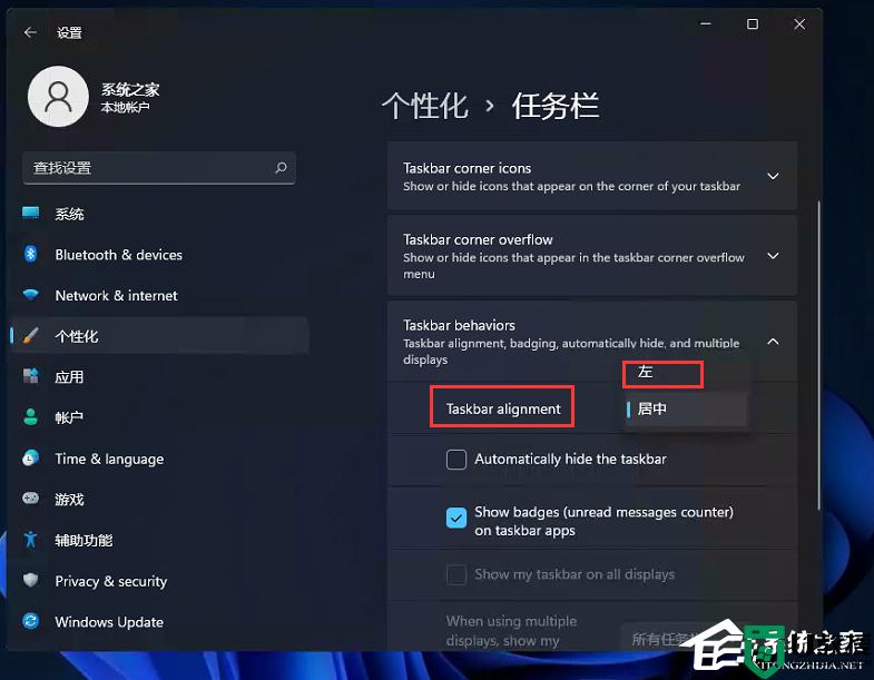 4、点击后,在【taskbar alignment】中选择开始菜单【左】对齐。