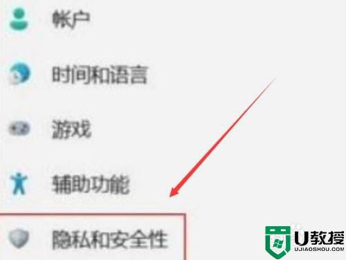 1、点击开始,然后在菜单栏中打开设置,在页面左边点击隐私和安全性。