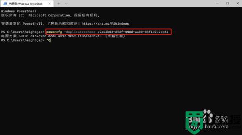 2、在终端下输入powercfg -duplicatescheme e9a42b02-d5df-448d-aa00-03f14749eb61然后回车。