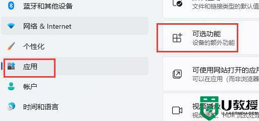 2、这样可以打开设置,然后在左边栏找到“应用”,进入后点击“可选功能”。