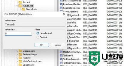 4、新建完成后,双击打开这个文件,将数值更改为“0”即可将任务栏变细。