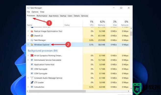 2、进入页面后,我们单击“进程”,找到“文件资源管理器”的后台将其关闭;