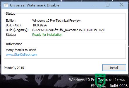 下载Universal Watermark Disabler工具,运行后会显示出当前系统的版本以及水印状态。「Status」中显示「Ready for installation」即已经可以去除水印了,点击「Install」按钮,稍等片刻它就会帮你去除版本号水印了。