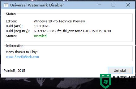 Universal Watermark Disabler 完成操作后会提醒你即将进行注销工作,所以你最好是保存手头上的工作和进程。注销后再次运行 Universal Watermark Disabler 就会显示已经安装了的状态,如果想要恢复水印的话点击「Uninstall」按钮就可以了。