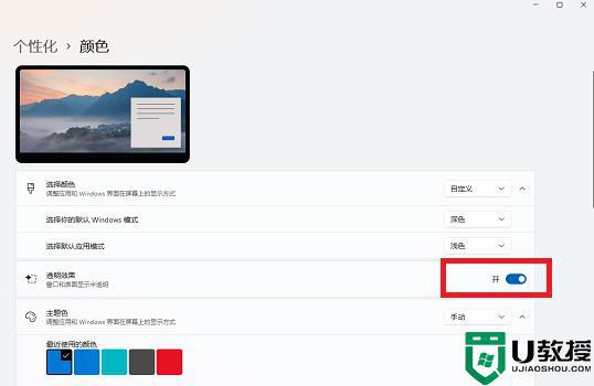 4、然后在其中找到“透明效果”,将它右侧的开关开启就可以设置透明窗口。