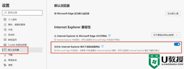 3、在设置界面中找到“默认浏览器”,然后开启“允许在 Internet Explorer 模式下重新加载网站”