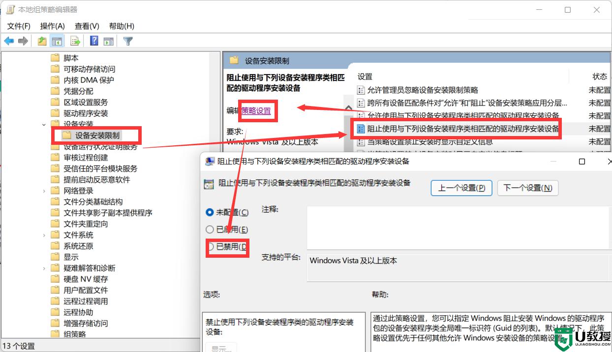 3、然后点击策略设置,关闭“阻止使用与下列设备安装程序类匹配的驱动程序安装设备”即可。