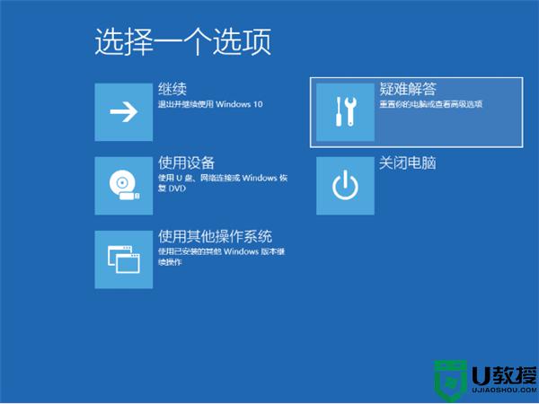 2、正常重启电脑后会直接进入到选择一个选项,在这里我们选择疑难解答选项,如下图: