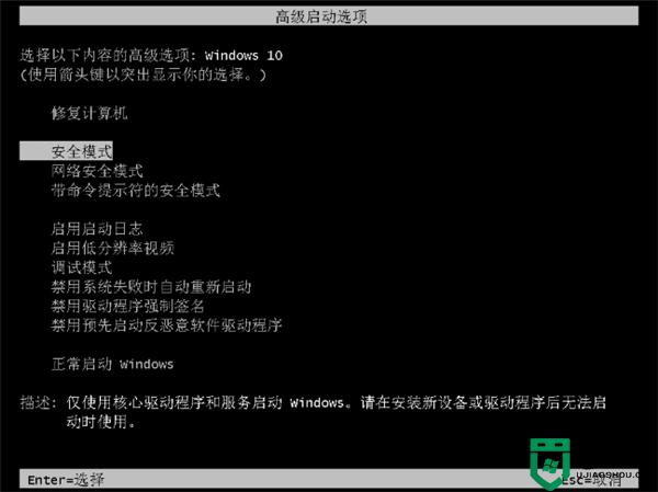 6、正常重启电脑后,在高级启动选项中。我们使用方向键上下选择,选择安全模式,如图: