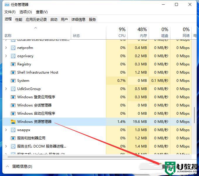3、任务管理器窗口,选择Windows 资源管理器进程。点击右下角的【重新启动】,即可重启Windows 资源管理器,这其实是Windows 资源管理器进程explorer.exe结束后,又重新启动的过程;