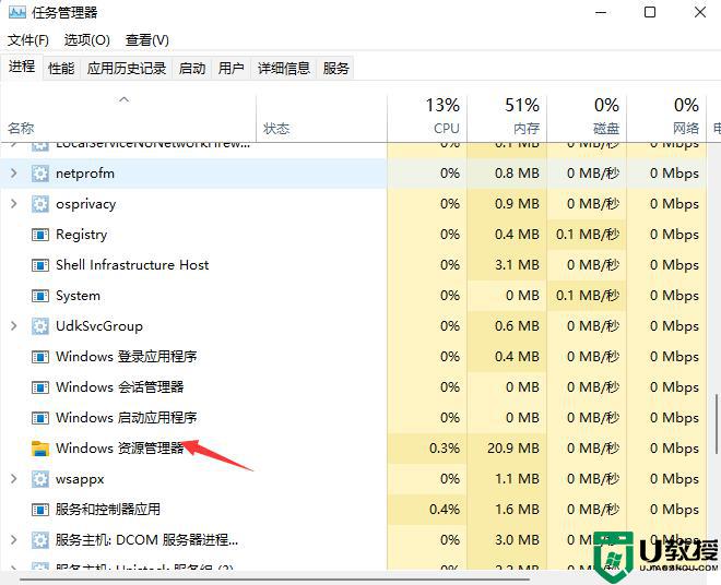 2、任务管理器窗口,点击左下角的【详细信息】,可以切换到详细信息界面,默认显示【进程】选项卡,往下找到【Windows 资源管理器】进程;