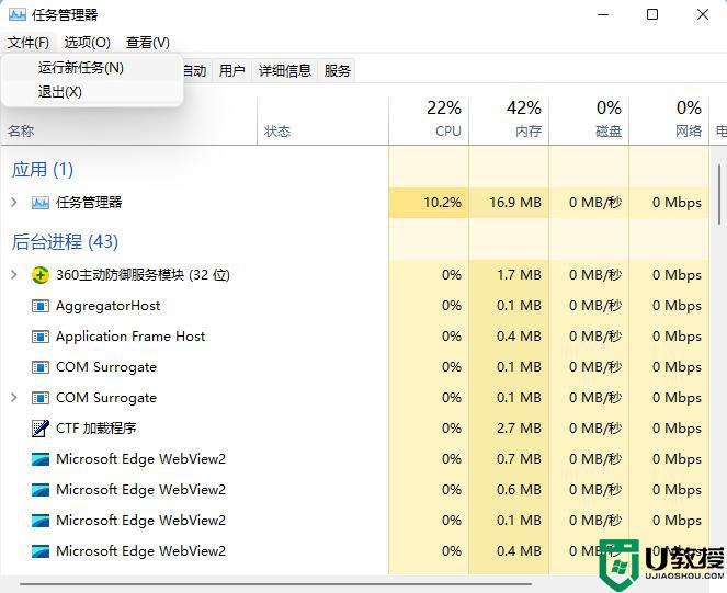 4、如果不小心结束了Windows 资源管理器进程,也可以在任务管理器窗口,点击左上角的【文件】,在打开的下拉项中,选择【运行新任务】;